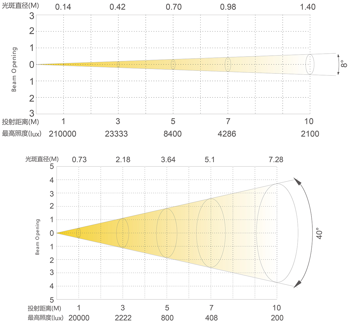 射距,光斑直徑與照度:
