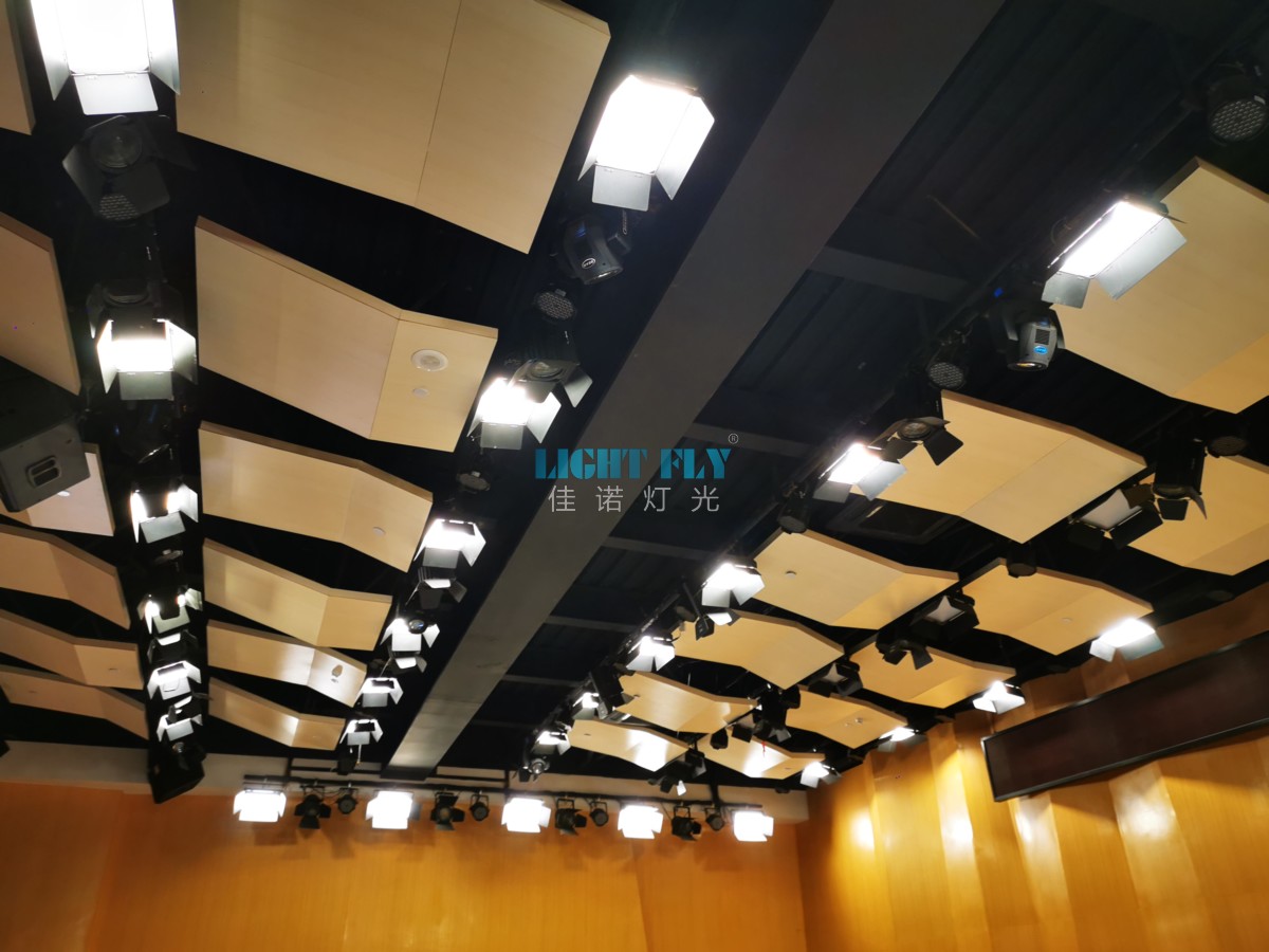 電腦燈主要布置在舞臺上空的頂光燈桿上,采用DMX信號連接電腦控制臺,可任意調(diào)整燈具投射角度,亮度,變換圖案,光束大小,色彩等功能,完全能滿足各種演出劇目對數(shù)字化電腦燈的變化要求。