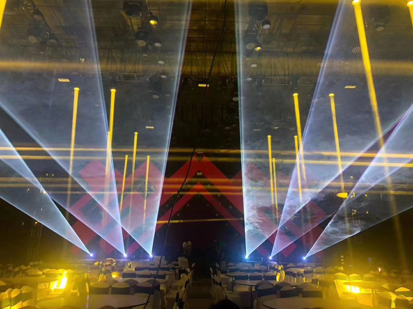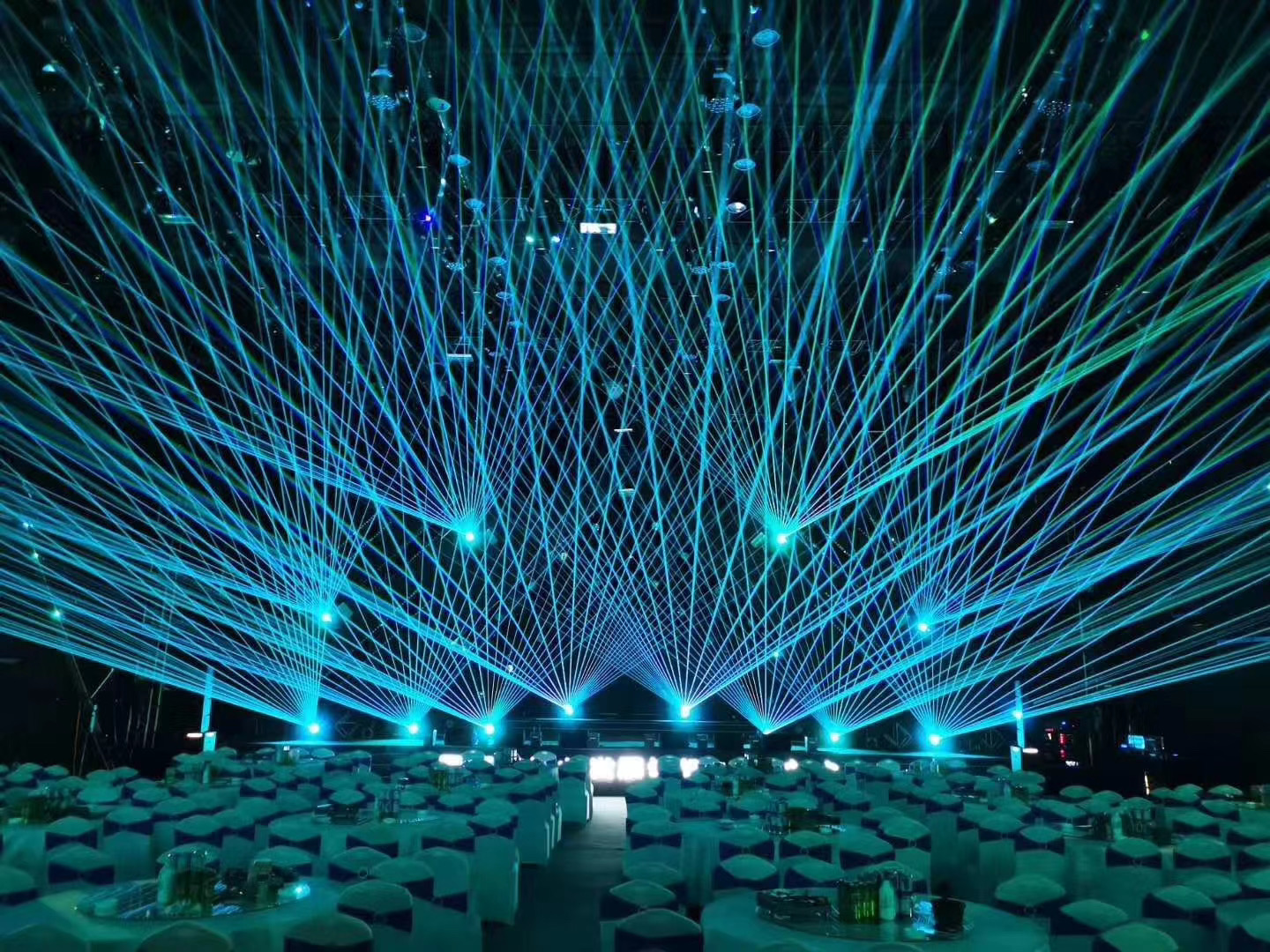 用高亮度和多色彩的激光打出多束交叉的光束,在交織過程中激光的顏色可切換變化,如明亮多采的“光網(wǎng)”一般。這種“光網(wǎng)”手法簡單,但在夜空中的效果非常好,深受客戶的喜歡,使用率高。該手法適應(yīng)于室內(nèi)室外各種場合,一般在空中施放過多層煙霧之后,打出此“光網(wǎng)”,其效果更佳,很容易調(diào)動(dòng)場上激動(dòng)的情緒,將場面推向高潮。