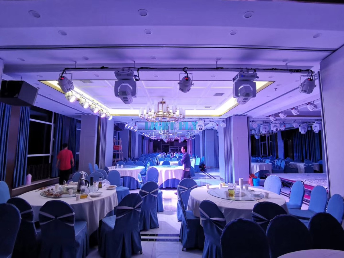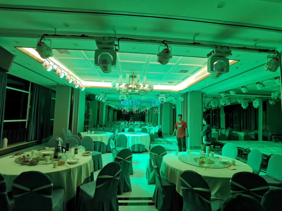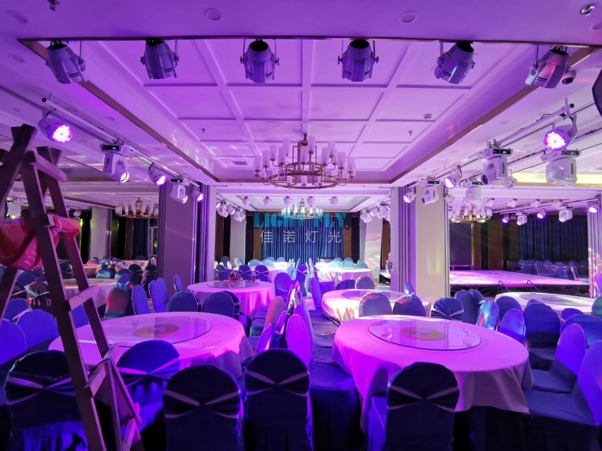 酒店更新了宴會廳燈光,全部采用高端款白色54顆3W三合一LED帕燈,白色款260W光束燈,白色款200W四眼LED面光燈,八路觸摸老虎控臺,薄霧煙機等燈光控制臺設(shè)備,為婚慶,演出提供了美輪美奐的燈光秀,廣州佳諾燈光設(shè)備有限公司是一家十二年從事智能化演藝燈光研發(fā)、生產(chǎn)、銷售、服務(wù)于一體的國家高新技術(shù)企業(yè)。其自主品牌【佳諾燈光LIGHT FLY】產(chǎn)品涵蓋專業(yè)舞臺燈光、LED演藝照明,文旅亮化等領(lǐng)域,廣泛應(yīng)用于劇院、體育場館、電視臺及各種演出場所。